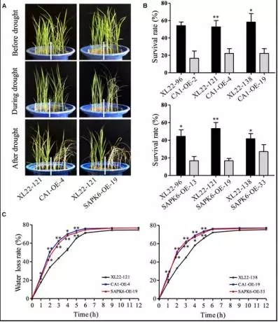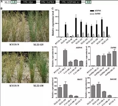 水稻轉基因材料:XL22(OsbZIP46CA1+SAPK6),CA1-OE(OsbZIP46CA1),SAPK6-OE(SAPK6)