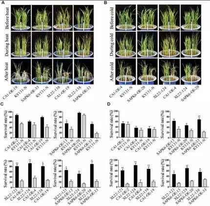 分別取XL22、CA1-OE、SAPK6-OE、KY-131-N的4葉齡種子材料,每個3個生物學重復,均進行42℃ 12小時,4℃5天處理,最后正常環境下生長7天,觀察這各材料之間的葉卷曲清苦以及存活率,結果顯示,XL22表現為個更高的存活率(圖5C),更加輕微的葉片卷曲(圖4A),表明XL22相較于單基因轉化株與非轉基因株擁有更強的耐熱、抗寒能力。