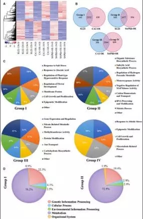 c)由于轉基因材料中過表達基因為bZIP家族轉錄因子及其活性激活基因家族,研究者重點關注了3個材料中轉錄上調的基因,這些基因被劃分為4類:Group1,XL22相較于CA1-OE特有上調基因,645個;Group2,XL22相較于SAPK6-OE特有上調基因,500個基因特異上調;Group3,CA1-OE相較于SAPK6-OE特有上調基因,398個;Group4,SAPK6-OE相較于CA1-OE特有上調基因,869個。Group I主要分布在“Response to ABA”、“Regulation of Plant-type Hypersensitive response”等GO term;Group II主要分布在“Organic Substance Biosynthetic Process” 、“Salicylic Acid Biosynthetic Process” 、“Regulation of Hydrogen Peroxide Metabolic Process”等GO term;Group3主要分布在“Gene Expression and Regulation”、 “Nitrate Related Metabolic Process” 、 “Carbohydrate Biosynthetic Process” 等GO term;Group4主要分布在 “Cytokinesis and Cell Proliferation”、“Microtubule Related Process”、“Response to Abiotic Stress” 等GOterm(見圖6C)。因此推測,XL22中的兩個基因可能激活了不同的干旱脅迫應答基因。