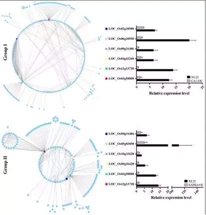 d)為了揭示GroupI 、Group2兩個基因集內部的基因調控關系,研究者基于STRING數據庫分別繪制了上述兩個基因集內部基因的蛋白互作網絡圖。如圖7所示,GroupI蛋白互作網絡中包含481個PPI(protein-protein intereaction,PPI),Group2中包含280個PPI。其中,有6個基因在蛋白互作網絡中均處于非常中心的位置(與之互作蛋白數量越多,越靠近中心位置)。其中,3個(LOC_Os12g13720, ?LOC_Os03g58800, ?LOC_Os09g31486) 在兩個蛋白互作網絡中均處于中心位置,分別編碼 PDR ABC transporter, a ATPase, and a DnaK/Hsp70s family protein,可能在干旱應答過調控網絡發揮著非常關鍵的;其他3個基因(Group1特異:LOC_Os04g42260 ?LOC_Os02g38580,Group2特異:LOC_Os05g03050)分別編碼protein phosphatase、Rad51、Hsp90 ,從功能可以看出,它們與水稻干旱應答同樣相關。