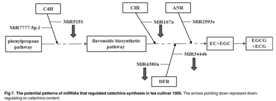 茶樹(shù)(Camellia sinensis),富含兒茶素,是風(fēng)靡全球的非酒精飲料之一。兒茶素是茶葉中重要的組成部分,包括脂型兒茶素(如:ECG和EGCG)和非脂型兒茶素(如:EC和EGC)。EGCG是茶葉中含量最豐富的兒茶素并且具有較強(qiáng)的抗癌效果,可以制約癌細(xì)胞的生長(zhǎng),抑制雄激素受體的功能并調(diào)控癌細(xì)胞的生存,血管的生成和移動(dòng)。基于他們的分子構(gòu)成,兒茶素可以分為簡(jiǎn)單兒茶素和脂型兒茶素。在兒茶素的合成過(guò)程中有許多酶的參與,如查耳酮合酶(CHS),查爾酮異構(gòu)酶(CHI),黃烷酮醇4-還原酶(DFR),花青素合酶(ANS),花青素還原酶(ANR)和類(lèi)黃酮3,5羥基化酶(F3’5’H)。MiRNA被鑒定為轉(zhuǎn)錄和轉(zhuǎn)錄后水平基因表達(dá)的重要調(diào)節(jié)因子,并且裂解目標(biāo)mRNA是植物中基因表達(dá)的主要調(diào)控方式。